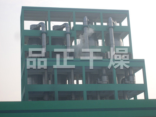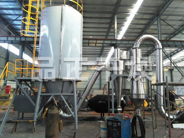本機組工作過程為料液通過隔膜泵高壓輸入,噴出霧狀液滴,然后同熱空氣并流下降,大部分粉粒由塔底排料口收集,廢氣及其微小粉末經(jīng)旋風(fēng)分離器分離,廢氣由抽風(fēng)機排出,粉末由設(shè)在旋風(fēng)分離器下端的授粉筒收集,風(fēng)機出口還可裝備二級除塵裝置,回收率在96-98%以上。