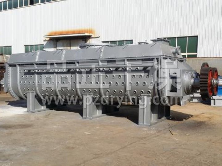 Wedge hollow blades are densely arranged on the hollow shaft, and the thermal medium flows through the blades through the hollow shaft. The heat transfer area per unit effective volume is large, and the temperature of the thermal medium ranges from - 40 ℃ to 320 ℃, which can be either water vapor or liquid: such as hot water, heat transfer oil, etc. Indirect conduction heating does not carry air away heat, and the heat is used to heat materials. The heat loss is only the heat dissipation to the environment through the insulation layer of the body. The heat transfer surface of wedge blade has self-cleaning function. The relative movement of the material particles and the wedge surface produces the washing effect, which can wash off the attached materials on the wedge surface, so that the clean heat transfer surface is always maintained during operation. The shell of the paddle dryer is Ω type, and two to four hollow mixing shafts are generally arranged in the shell. The shell has a sealed end cover and an upper cover to prevent the leakage of material dust and give full play to its role.