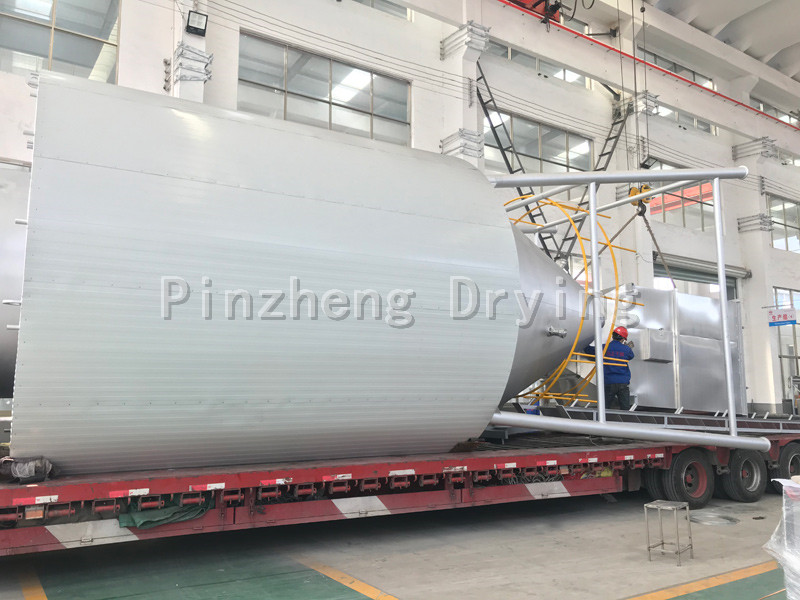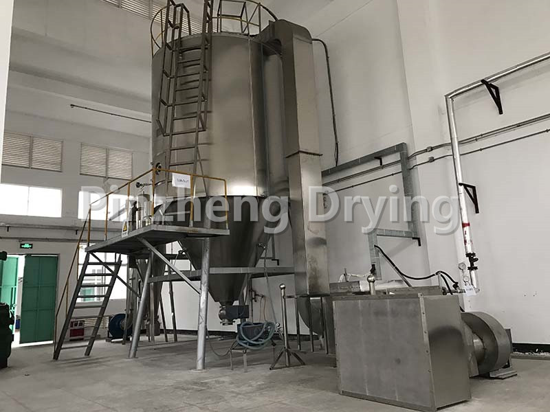 After filtering and heating, the air enters the air distributor at the top of the dryer, and the hot air enters the drying chamber evenly in a spiral shape. The feed liquid passes through the high-speed centrifugal atomizer on the top of the tower body, and (rotating) spray into extremely fine mist like liquid beads, which can be dried into finished products in a very short time in parallel with hot air. The finished product is continuously output from the bottom of the drying tower and the cyclone separator, and the exhaust gas is discharged by the fan.